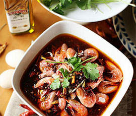 9、锅洗净擦干,放入50克品利特级初榨橄榄油,烧至9成热(冒烟),然后将热油均匀浇在北极虾上,最后放上香菜装饰即可。