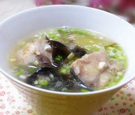 8、小火20分钟后放黑木耳再次煮开,出锅,盛入汤碗中,面上撒蒜叶。
