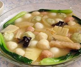 圆骨汤、剔骨肉、皮肚、牛肉丸、猪肉丸、鱼丸、腐竹、笋片、木耳、菠菜、杏鲍菇。