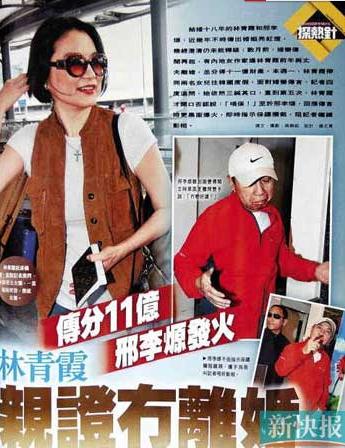 林青霞跟邢李原婚变传闻自2006年未曾间断,邢李原一度出动公司公关出面澄清,可惜传闻越演越烈。最近又传一新版本,指林青霞离婚后,分得丈夫42亿元台币财产与香港飞鹅山豪宅,又指两人早于4、5年前已经分居。