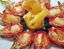 3、把木瓜汁、黄油、土豆泥一同搅打成汤汁,装入火龙果壳制成的器皿中,放入珍珠虾即成。