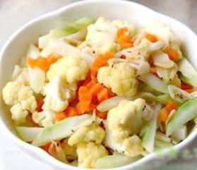 5、热油锅,将花菜、胡萝卜片先过油翻炒熟。