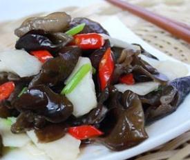 4、热油锅,先将黑木耳和胡萝卜片倒入锅里煸炒透。