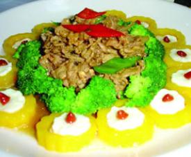 1、牛儿肉切长3厘米、宽2厘米的薄片;南瓜去片,切高2厘米、直径为4厘米的圆柱形,用梅花模子压成梅花形状,把鱼蓉酿入南瓜中。