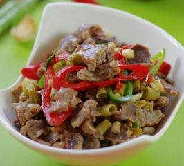 6.翻炒均匀,加入青蒜和小米椒,翻炒3分钟。