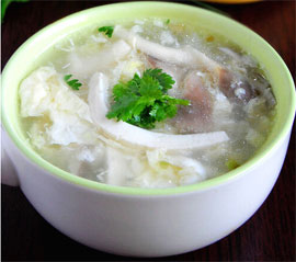 9、水开以后打入蛋花,调入少许鸡精和香油。勾薄芡,最后撒上香菜末即可。