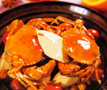 2、 坐锅点火放油,油至8成热时,倒入葱、姜、蒜、牛肉末、泡椒丁、花生米、料酒、高汤、螃蟹,加入盐、白糖、酱油、豆腐、鸡精待锅开时淋入香油即可。