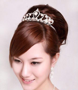 蓬松凌乱是2012盘发的最新潮流元素之一,这款发型适合俏皮妩媚的新娘。一高一低的双发髻,左右两侧头发一多一少,蓬松美和凌乱美尽显无疑。头顶优雅的白色珍珠发饰让造型更出位。