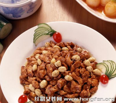 4、之后,加入半碗水,煮开后,加入鸡丁,调味,收汁,最后淋上香油即可。