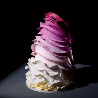 婚纱上,层叠的雪纺褶皱令裙摆更加唯美漂亮。以此为灵感的婚礼蛋糕,不规则的层层叠叠也很有浪漫气息,再加上渐变的色彩,犹如花朵般美艳。