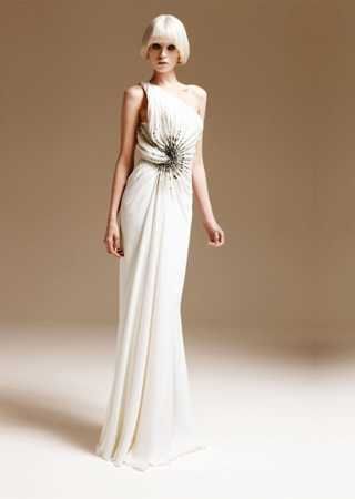 白色斜肩礼服典雅端庄,可以将肩部微微后倾,双手自然摆动,同时将脚呈丁字型摆放,和礼服浑然一体,突出新娘的曲线。