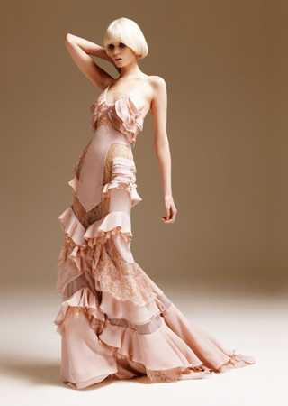裸色系的吊脖礼服,层层叠叠的荷叶边让整件礼服充满着浪漫的感觉,这样手摸脖颈的姿势,可以很好的突出新娘胸部的曲线,突显性感之风。