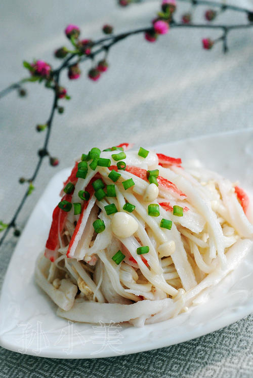 4、蟹肉棒撕成丝,金针菇每颗与每颗之间也要撕开,加盐、味精、香油、米醋、香葱拌均即可。