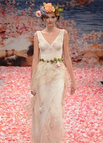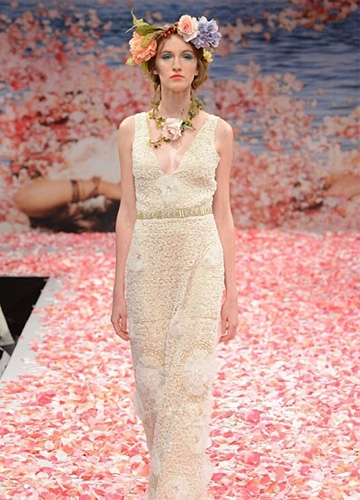 波希米亚的浪漫风潮近年来对婚纱影响颇深,Claire Pettibone2013秋冬婚纱更是将这一浪漫演绎到了极致。裙型一律采用高腰式背心裙设计,有些古典美。浪漫的蕾丝及轻薄的绣花面料营造出柔软、飘逸,极具女性柔美气质的氛围。浪漫之余,还有着些许的小性感,修身裙身曲线流畅,蕾丝裸背的设计令人浮想联翩。尤其是背部飘逸的绸缎,更使这份浪漫多了份潇洒。