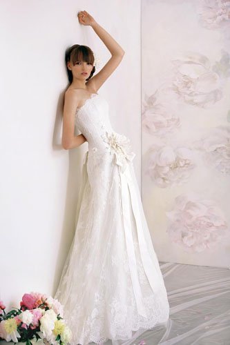 简约的A型婚纱适合身材丰满的新娘,可以减少拖沓沉重的感觉。腰部的蝴蝶结缎带轻垂落下增添了礼服的隆重感觉。