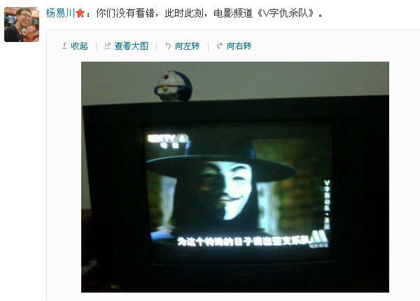 杨易川:你们没有看错,此时此刻,电影频道《V字仇杀队》。