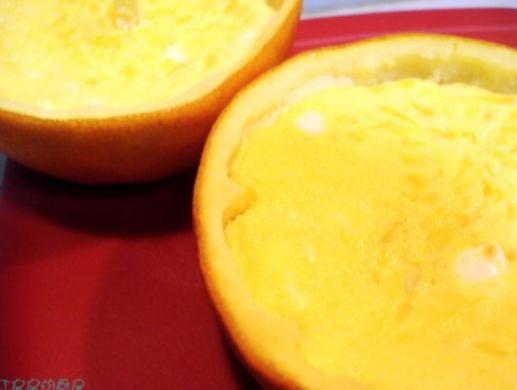 3.橙子对切两半,用手和勺子在橙子里挤呀搅呀,把橙汁儿和橙肉都挤到装有蛋液的碗里(其实也不用真的挤太干净,反正蛋液一会儿也得再倒进橙子皮里,所以用勺子掏橙肉的时候不要太过用力把橙皮儿弄破了)