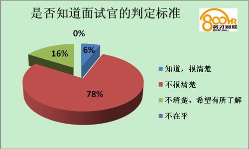 调查显示,78%的人不是很清楚面试官对面试礼仪的判定标准,16%的人不清楚,希望有所了解,只有6%的人很清楚。英才网联就业指导专家表示,目前经济和文化背景虽然为招聘求职提供了双向选择的环境,但对于大部分的职场新人来说,更多的是一种单向选择,因此,要想提高自己的面试成功率,就非常有必要了解面试官选择候选人的判定标准,才知道如何有针对性地去提升和改进自己,达到要求。