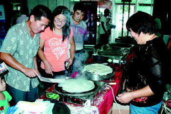 上冶镇西沟村村民宋全柱夫妇对一款新智能电磁煎饼鏊子很感兴趣。