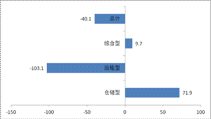 2011年物流企业主营业务利润额比上年下降40.1%。从物流企业类型看,2011年仓储型企业主营业务利润额比上年增长71.9%;综合型企业增长9.7%;运输型企业下降103.1%。在运输型企业中,道路运输企业主营业务利润额比上年增长21.8%,增幅提高5.8个百分点,拉动主营业务利润额增长2.0个百分点;水上运输企业主营业务利润大幅下降98.2%,影响物流企业主营业务利润下降46.7个百分点。