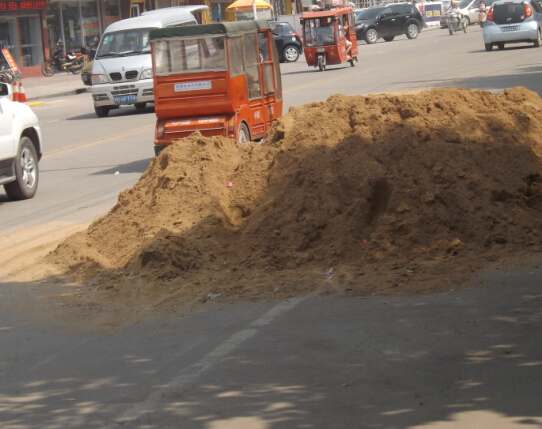 近日,临沂市城市管理局罗庄城管分局接到市民刘先生举报称:罗庄区罗庄街道办事处韦姜屯社区中心街有大量沙堆放在路上,都快到路中心的斑马线了,上下班高峰、学生放学时,挤的水泄不通,连过一辆电动车的空都没有,接送孩子上学都得绕很远路,太不方便了,你们快来管管吧。