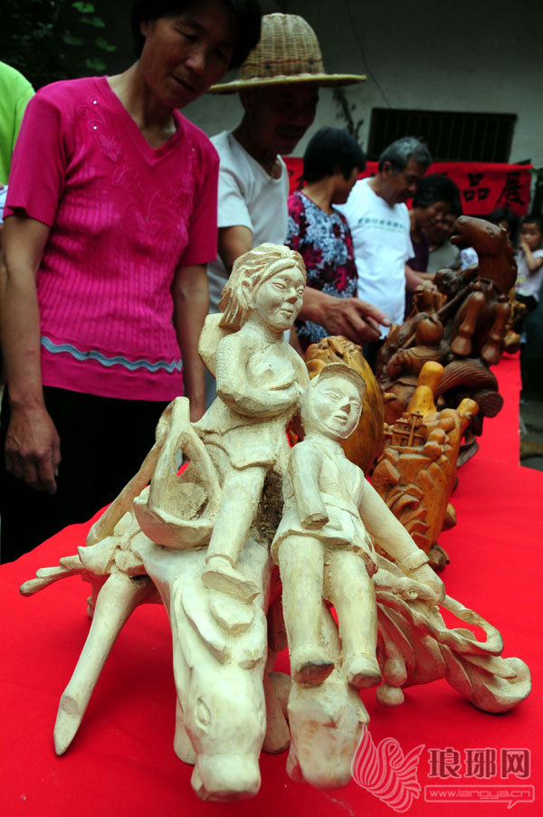 6月22日,村民在郯城县马头镇宋庄村宋玉云家里参观展览的木雕作品《红嫂乳汁救伤员》。