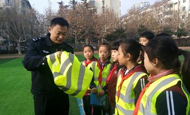 临沂市公安局交通警察支队直属一大队副大队长李毅为学生讲解荧光衣的穿法