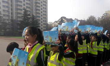 另外,临沂市公安局交通警察支队直属一大队副大队长李毅还为学生发放了交通安全宣传材料——印有文明出行标语的卡通书皮。刚拿到书皮,学生们就叽叽喳喳地讨论起了书皮上的文字图案:“这个书皮是蓝色的,很漂亮”、“上面有警察叔叔,还有‘文明出行,从我做起’”不知是哪位小朋友兴奋地将书皮高举了起来,其他小朋友看见后竞相模仿,纷纷比试看谁举得更高。