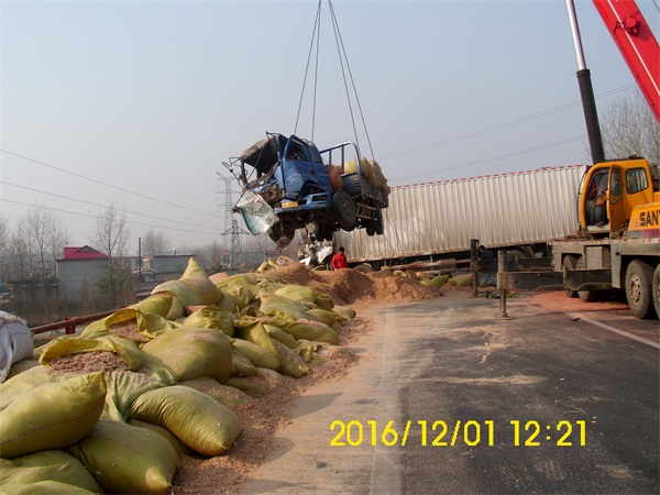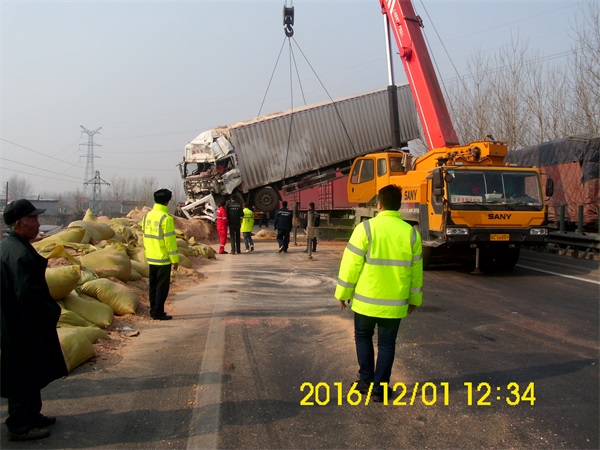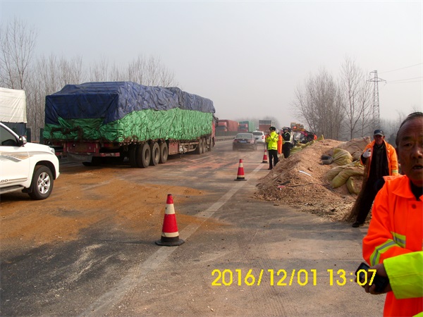 2016年12月1日因雾霾天气,江苏高速公路封闭,所有的车辆全部堵在山东境内,因雾天浓见度低,后续车看不清停靠等待放行的车辆,一辆满载木屑的大货车突然撞上了排队的车辆“长龙”,与前车追尾,货物全部洒落,货车横在路中央,堵住了后面所有通往上海方向的车辆,齐鲁交通集团临沂分公司应急救援中心王伟主任立即组织救援力量在第一时间内将吊车、拖车、救援车、维修车等安排到位,等交警勘查事故结束后,及时的将横栏在路中间的事故货车吊起至应急车道,迅速清理了行车道与超车道洒落的货物,在最短的时间内保证了高速公路的畅通,顺利通行的驾乘人员们看到如此迅速的应急救援队伍,边走边挥手向救援队伍的人员致谢!