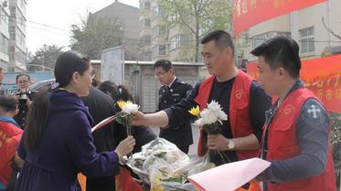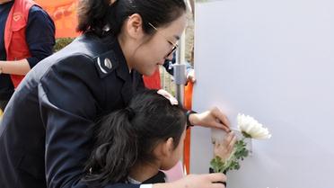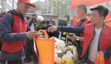 志愿者向市民发放祭祀鲜花和环保袋