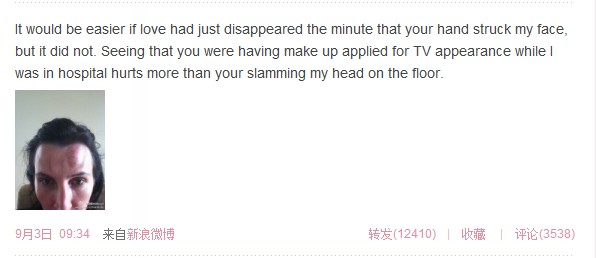 我在医院拍片子的时间是凌晨2点15,做CT透视的时间是2点46。而那时你正在你的微博上贴宣传语。我和丽迪雅孤单的呆在医院,而你却在录制电视节目,就如同一切都没发生过。这是不对的!