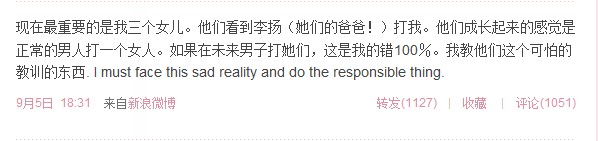 现在最重要的是我三个女儿。他们看到李阳(她们的爸爸!)打我,他们成长中会觉得一个男人打一个女人是很正常的事情。如果在未来有男子打她们,这100%是我的错。我教会了她们这个可怕的东西。我必须面对这个悲伤的事实,做一些负责任的事儿。