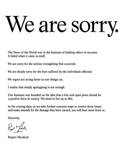 默多克今日在英国主要报章刊登全版道歉声明