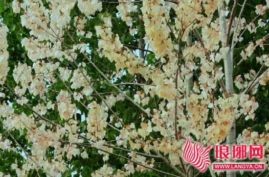 琅琊新闻网讯(特约记者 陆勇)眼下时节,杨树的叶子应该是深绿色。然而,在郯城县郯城街道王卸村西的一棵杨树上,所长出的叶子雪白如花,酷似一棵“花树”,便引来了许多行人驻足观看,甚至一时被谣传成“奇树”、“神树”等。