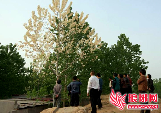 连日来,当地一些好奇市民以及许多外县区人员也纷纷前往欣赏,一位不愿透露姓名的江苏省新沂市男子一度想高价买走此树,但被该树户主拒绝。距“奇树”一步之遥的住户王永凤女士介绍:此树已栽植七年多,从未出现过这种现象,今年清明节前后这棵树开始发芽,但发出的叶芽红红的,非常好看,可随着叶子的慢慢放开,其颜色也越来越白。为什么会长出白叶子?她也感到奇怪。在现场观看此树的汪卸村年逾八旬的陈洪德老人说:“我也是头一回看到过这么奇怪的树。”