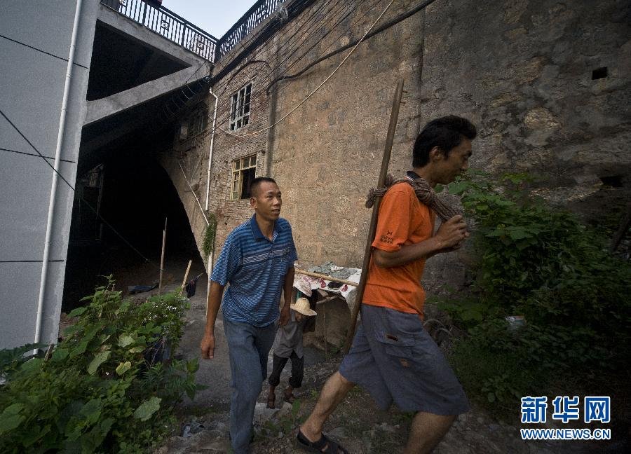 早上6点,41岁的“棒棒”王存辉(右一)从旅舍走出,出去找活。王存辉是湖北巴东县沿渡河镇红岩村人,在此居住了一周(8月9日摄)。