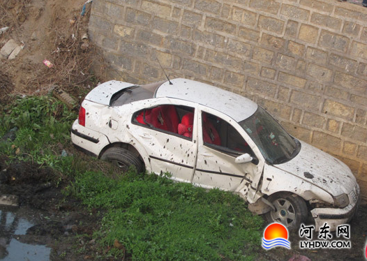 当记者赶到现场的时候,周围已经站满了围观的市民。记者看到,桥上的石质护栏被撞断了10多米,桥洞下,一辆白色轿车正“趴”在沟内的护坡旁,除前挡风玻璃外,其余的玻璃都已破碎,轿车的车身也因受到剧烈撞击大面积变形。但让人奇怪的是,这辆事故车辆冲进路沟后既不是车头朝下,也不是车尾朝下,而是“四平八稳”地停在那里。一名正在进行现场勘查的河东区交警大队肇事处理科民警告诉记者,通过现场的两道刹车痕迹,他们只能判断车辆似乎是甩尾后掉进了沟里,至于车祸发生的具体原因,由于找不到现场目击者,目前尚不能确定。下午6时20分,事故救援车辆赶到了现场,正设法将事故车从沟内拖出。