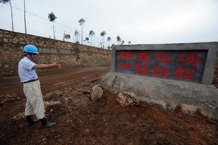 引发事件的帖子称:云南曲靖有5000吨铬渣倒入水库,致使水库致命六价铬超标2000倍。事后云南将30万立方米受污染水,铺设管道排入珠江源头南盘江。而曲靖官方则称,经过调查,不存在铬渣直接倾倒进南盘江和水库的情况。8月14日,由水利部珠江水利委员会组成的专家组来到曲靖铬废料非法倾倒点进行取样调查,以判定南盘江水系是否被污染。图为云南省曲靖市陆良县的铬渣堆放场。