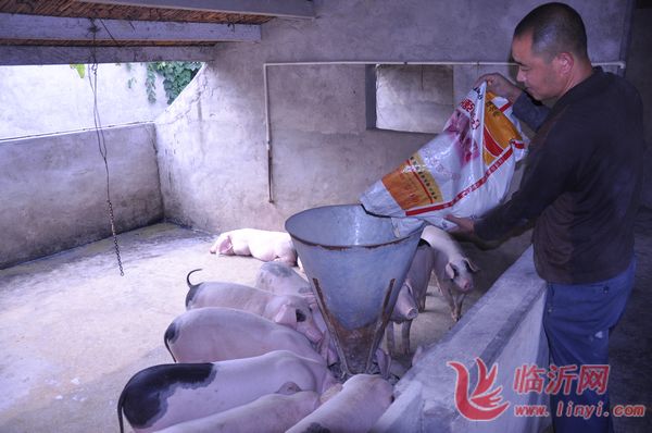 “猪价明年一定大跌,报道时简单点,和你拉的秘诀不要说得太多。”张玉斌一再叮嘱笔者。据了解,他从江苏购进“土猪仔猪”品种进行饲养,牢牢把握饲料与防疫两个关键,大大提高了成活率。他以玉米和豆粕为主自配饲料,注意营养均衡,如蛋白质过多过少都不行。防疫上以注射疫苗预防为主,对付“猪瘟”和“五号病”等,买疫苗一定注意买到真货。通过科学养殖,他目前生猪存栏量260头,一年出栏三次,年出栏500头,每头猪毛利平均2000元,纯利润500~600元,年纯收入20多万元。据了解,他是村里养猪规模最大的一户,村里拥有100头以上的养猪户还有30多家,都逢上机会多少发了一笔猪财。图为官庄村养猪大户张玉斌添加饲料。