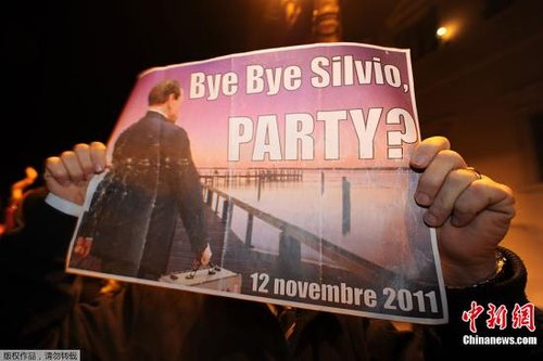 据意大利安莎社报道,意大利总理贝卢斯科尼已于12日向总统纳波利塔诺递交辞呈,正式辞职。图为11月12日,在意大利首都罗马,一名市民高举“再见,贝卢斯科尼”的海报。
