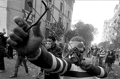 22日,在埃及开罗,抗议者在示威活动中使用弹弓。图/东方IC