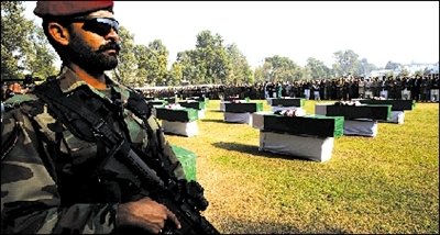 11月27日,在巴基斯坦白沙瓦,巴基斯坦士兵在葬礼上警戒。新华社发