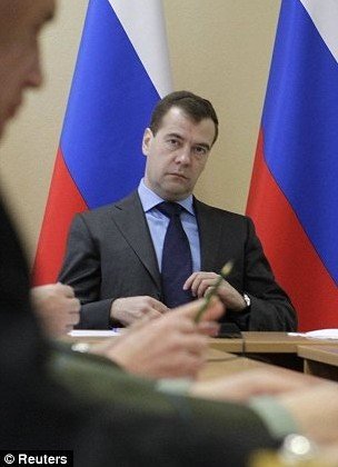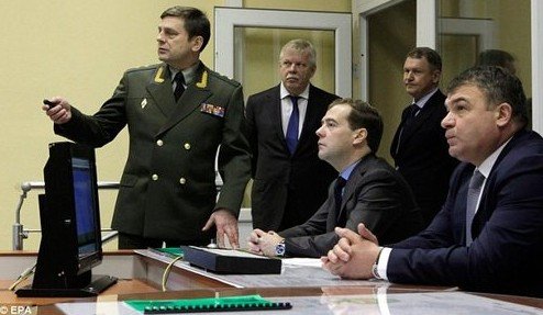 梅德韦杰夫中与国防部长谢尔久科夫右在雷达启动仪式上