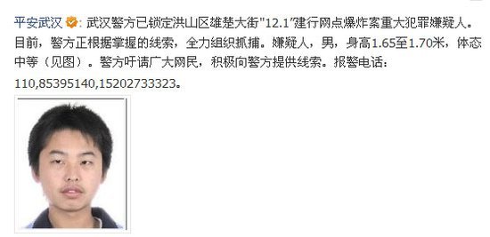 武汉警方官方微博公布正面照 全警全城大搜捕