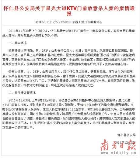12月5日,怀仁县公安局发布《关于怀仁县星光大道KTV门前故意杀人案的案情通报》。通报称,11月30日上午9时9分,怀仁县星光大道KTV门前发生一起故意杀人案,案发当日犯罪嫌疑人落网,并对故意杀人的罪行供认不讳。