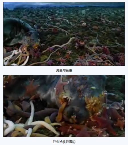 英国一支摄影队在南极厚厚的冰层下拍摄到大量五颜六色的海星和3米长的巨型虫。他们通过延时拍摄发现,大量深海生物临时聚在一起,疯狂地争吃一只沉入海底的死海豹。