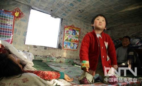 记者打量了一下小孙悦的家,这是一间用木板和泥巴建成的房子,十几平方米大小。为了防寒,四周围上了塑料布,但屋里还是很冷。几块石棉瓦搭成的门斗下,一块木板就是大门,这也是仅有的一扇门。屋檐下一堆煤,是志愿者5日送来的。灶房里两袋土豆是全家一冬的蔬菜。屋里糊的是低廉的卷烟纸,有的地方已经露出了泥土和木板。一台旧电视和手电筒是仅有的家电,没有衣柜,没有饭桌,甚至没有一把椅子。