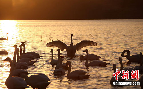 12月9日,数百只白天鹅在三门峡黄河湿地国家级自然保护区的河里游弋、嬉戏,吸引了众多游人及摄影爱好者。