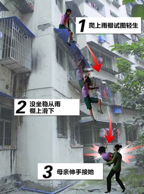 12月11日晚上约9时,涪陵区兴华花园小区上演了惊心动魄的一幕:因琐事与母亲吵架,一名13岁的女孩坐在约7米高的雨棚上,忽然滑了下来,正在楼下劝解的母亲见势伸开双手冲上去接,结果女儿砸在她的手臂上,然后“弹”了一下,摔到了地上。