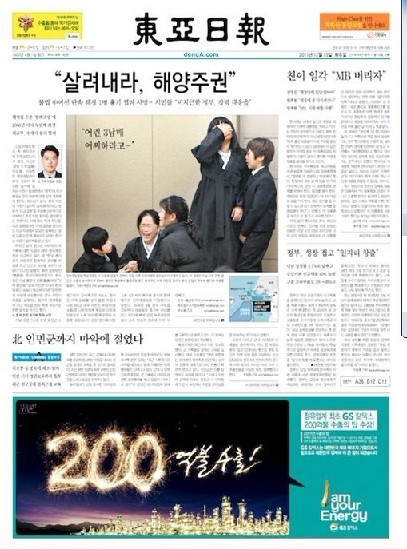 《东亚日报》在头版的重要位置发表题为《捍卫海洋主权 一海警在管制中国渔船非法捕捞时遇刺身亡》的文章,指出:“……韩国民间强烈呼吁对与海盗别无二致的中国渔船采取强硬的应对措施。中国渔船的抵抗越来越残暴……”,并批评说:“中国政府完全没有提及向死者及遗属道歉或防止此类事件再次发生的内容”,只要求“韩国方面保障中国渔民的合法权利,希望给予他们人道主义待遇。”文章援引中国国际问题研究所副所长董漫远在凤凰卫视中发表的言论,指责中国有意将责任转嫁给韩国。